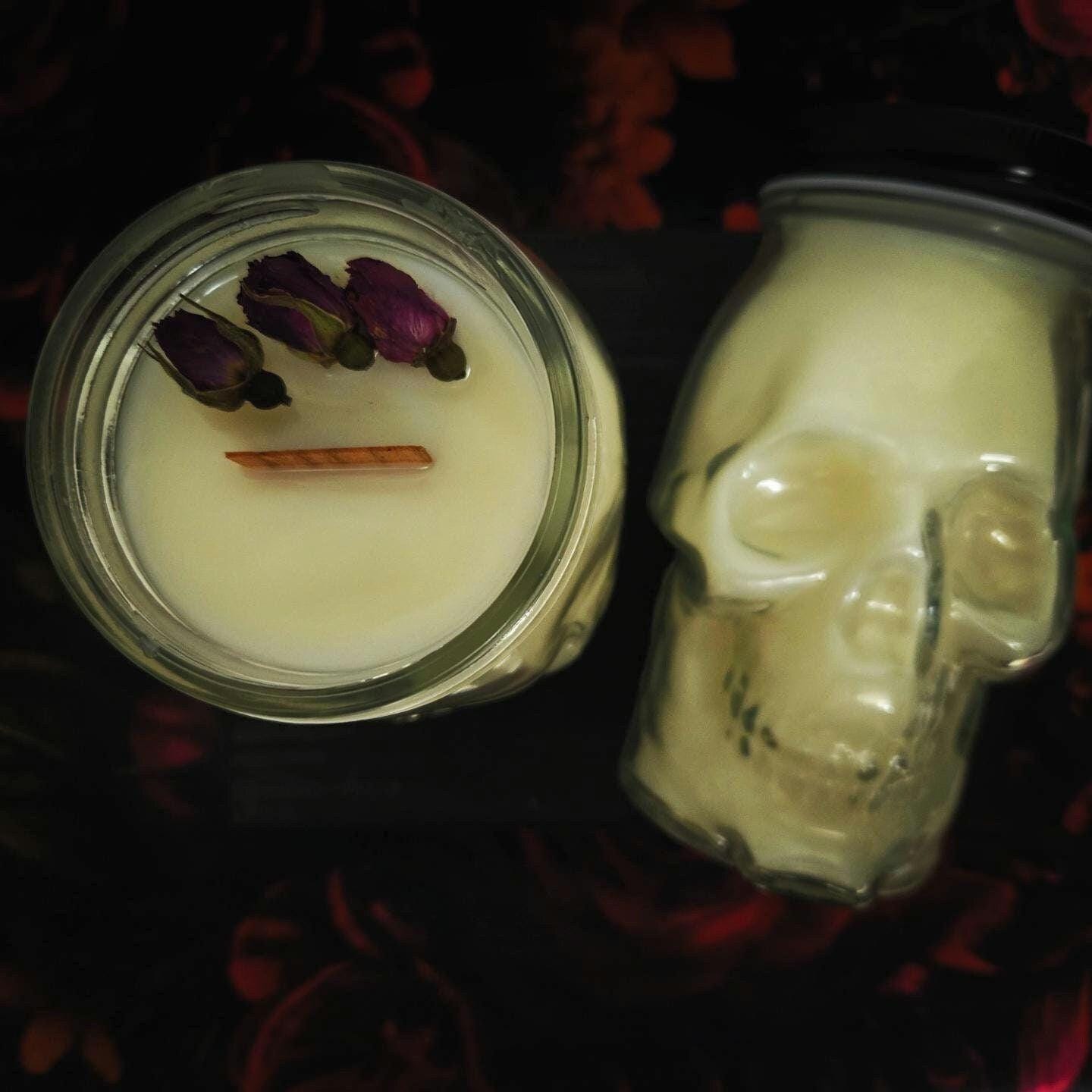 Scents of: funeral roses, powdery perfumes, cobblestone pathways, & burning incense. Topped with dried whole rosebuds.