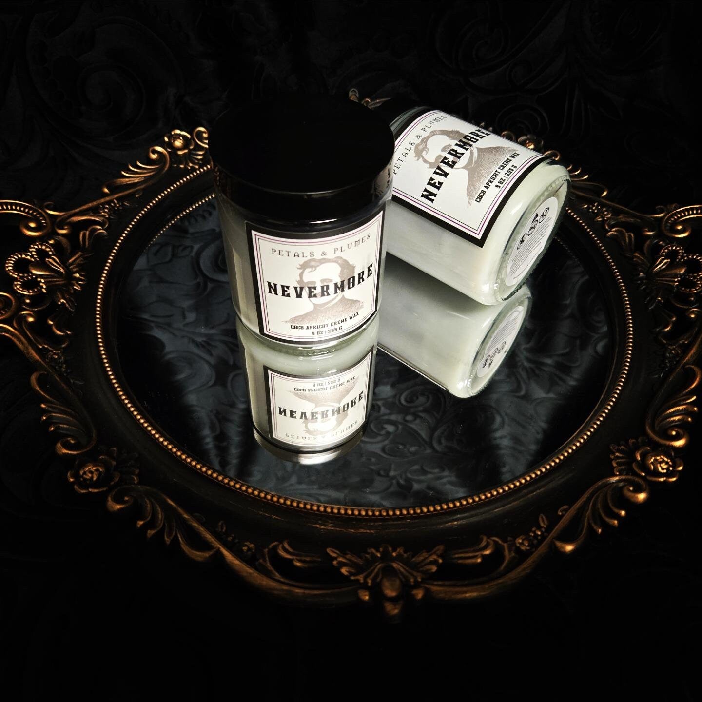 This candle features a captivating marbled design in a raven black dye. As the candle melts a iridescent purple shimmer will emerge from the wax. This evocative scent is reminiscent of the beloved poem, "The Crow", written by Edgar Allen Poe.